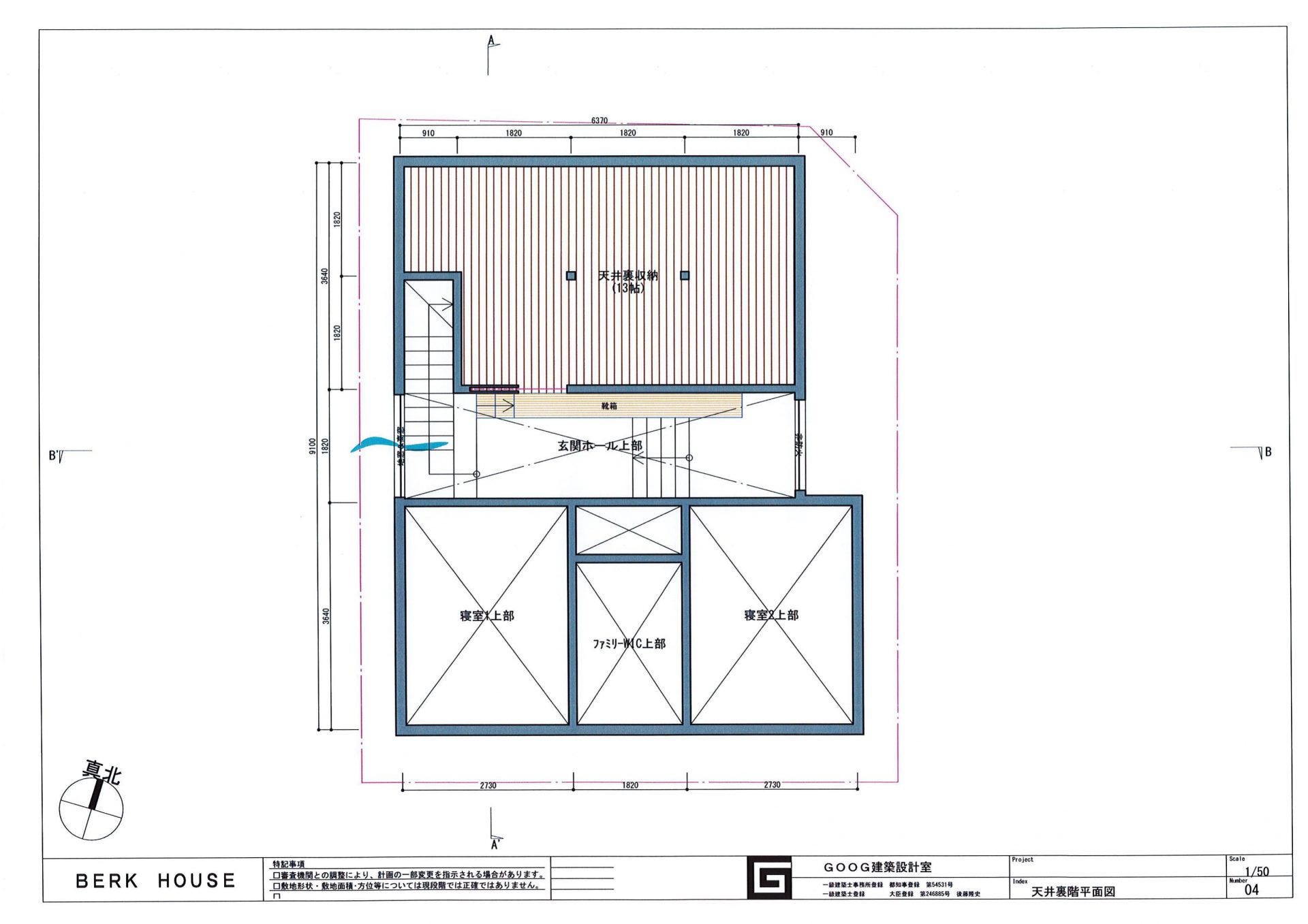 敷地の高低差は玄関を入ってからの内階段で解消、お施主様希望の収納力を担保するためにガレージの天井裏収納を設けたプランニング。