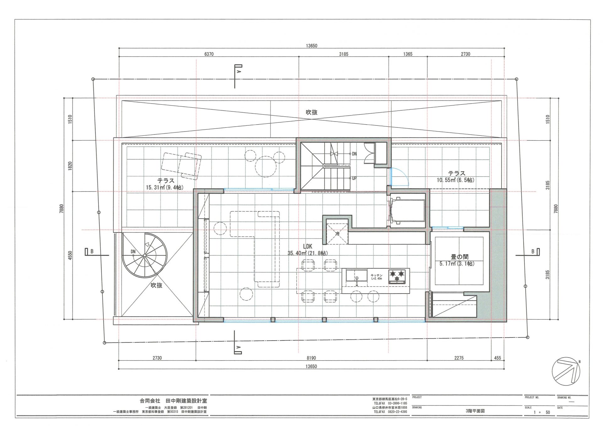 2階のテラスと3階リビングテラスを螺旋階段で結んでいるのも