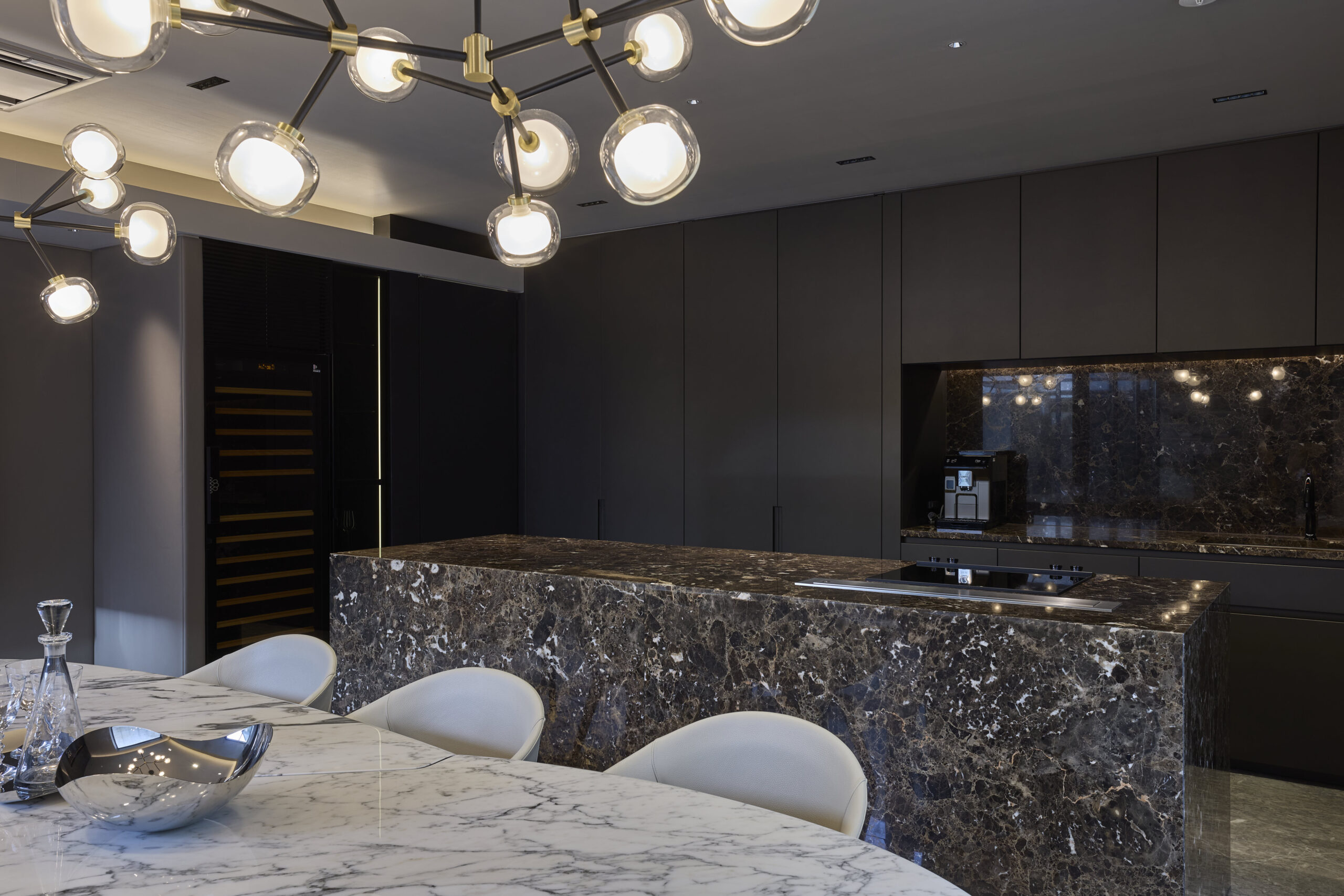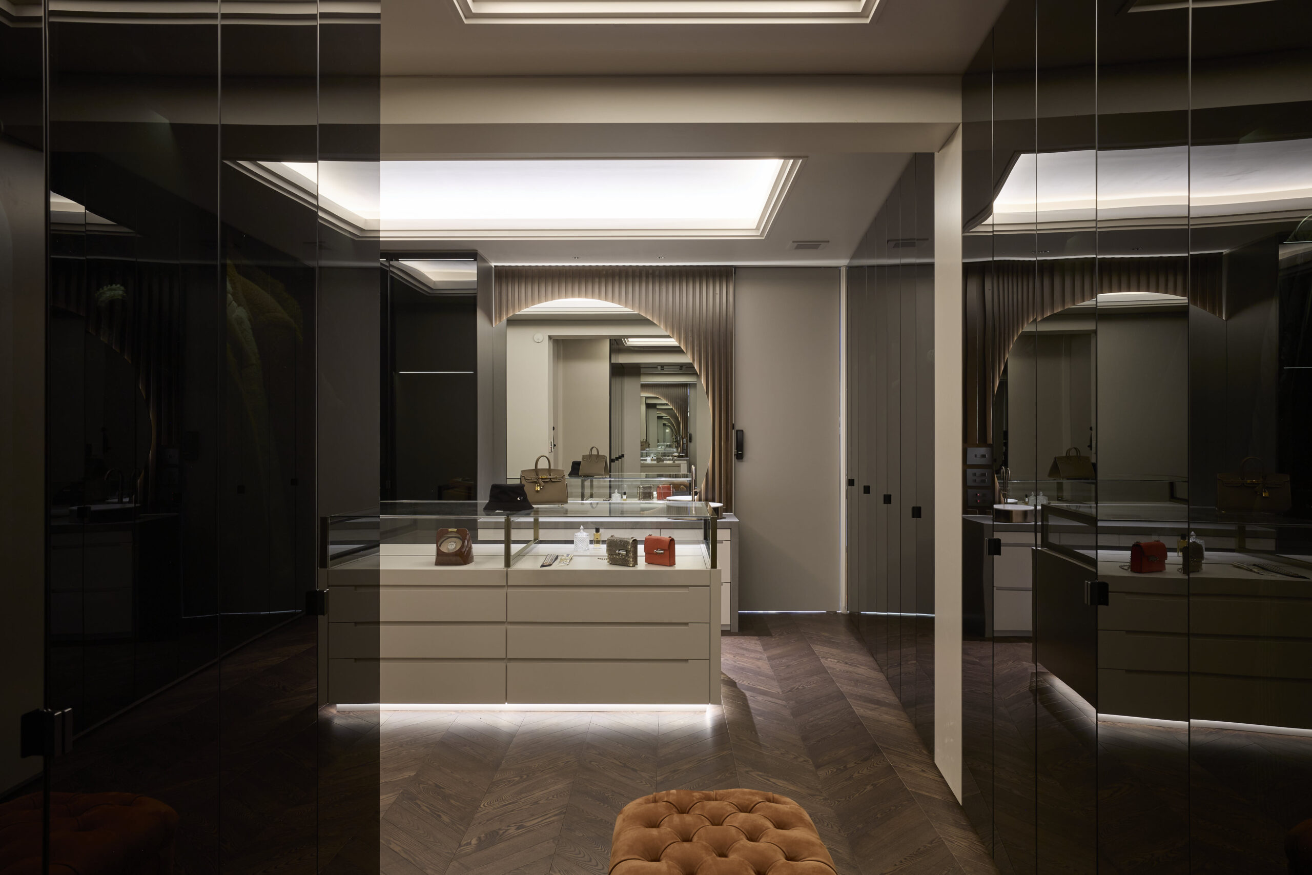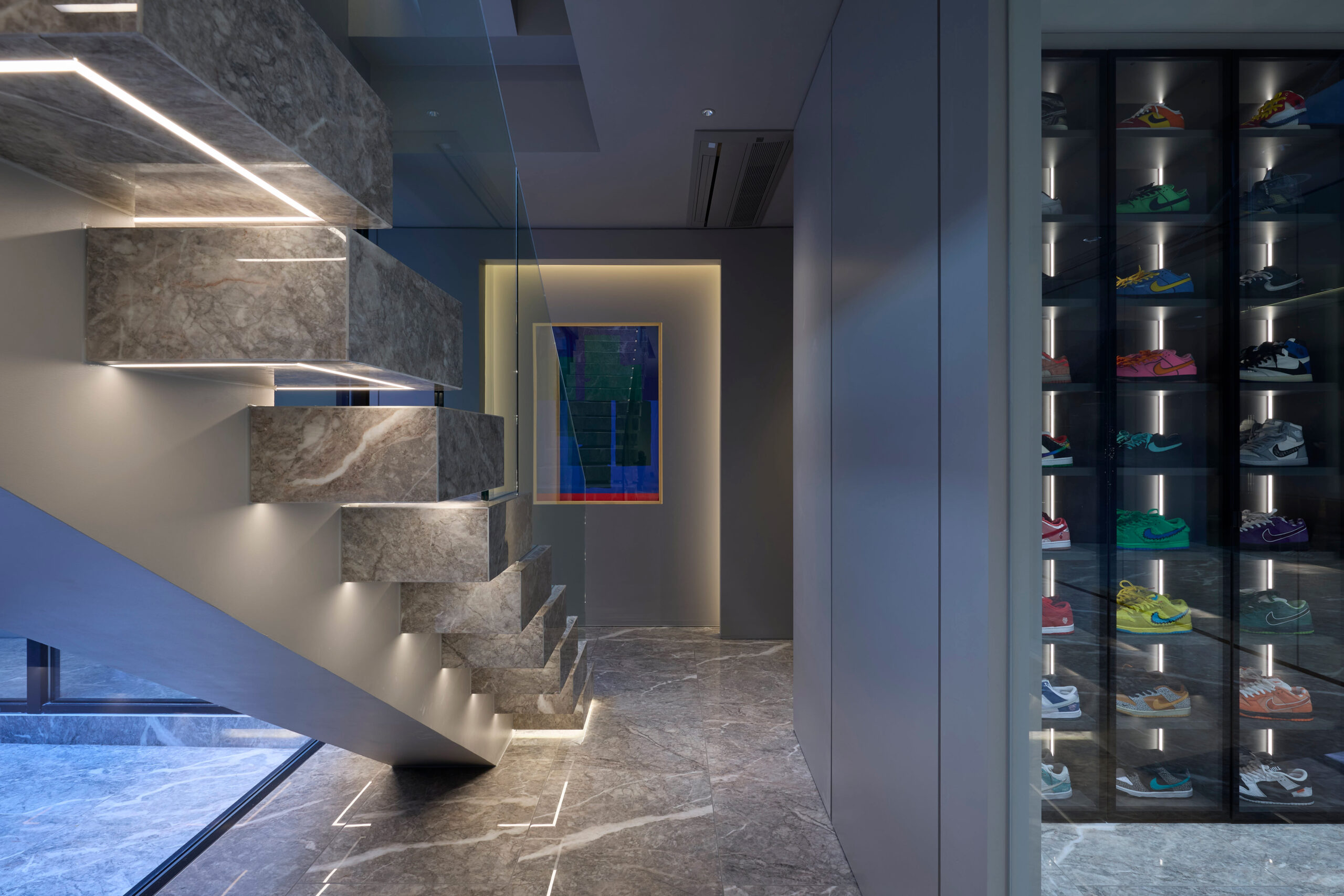家の中心にあるのは、中庭越しにあらゆる角度から愛車を鑑賞できるガラス張りの設計。さらに、スニーカーコレクションをディスプレイする光の棚や、ブティックのように仕立てられたクローゼットなど、住まう人の愛用品すべてがアートとして輝く、圧倒的な美意識に貫かれた邸宅です。